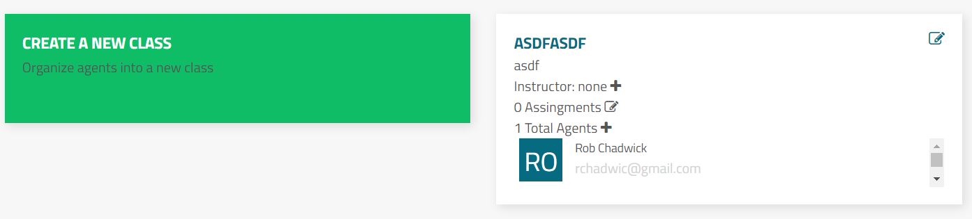 A class is a group of Agents. Currently, it serves only to help scope the Class/Course dashboard, but in the future will serve basic LMS functions. You manage classes from the "Classes" page under "Content" on the left side menu.