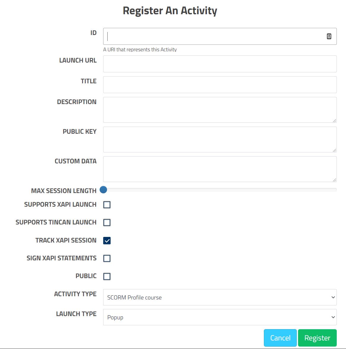 Activities can be remote resources. These resources live on a different server from the LRS, and can be displayed in a popup window, a bit like a traditional LMS. To register an external link as an Activity, click the large green "Register a Link" button. This will show a form like this: