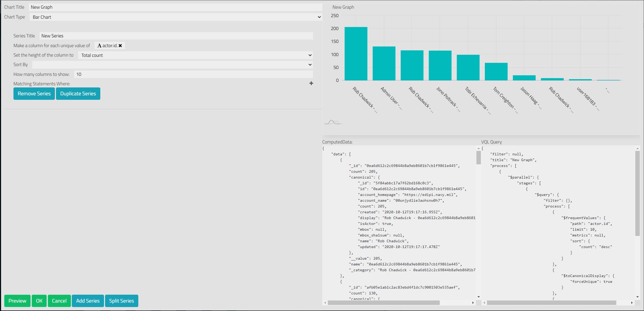 The chart builder interface is divided into 4 major sections. On the left is the series editor. This is where you'll make all your configuration changes. Top right is the render preview. Bottom right you'll find both the full data return by the analysis, and the computed query Veracity Query Language (VQL). You can use the VQL in a variety of places to reproduce this graph.