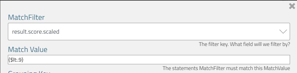 Clicking the dropdown in "MatchFilter" will give you a list of fields from the xAPI statement specification.