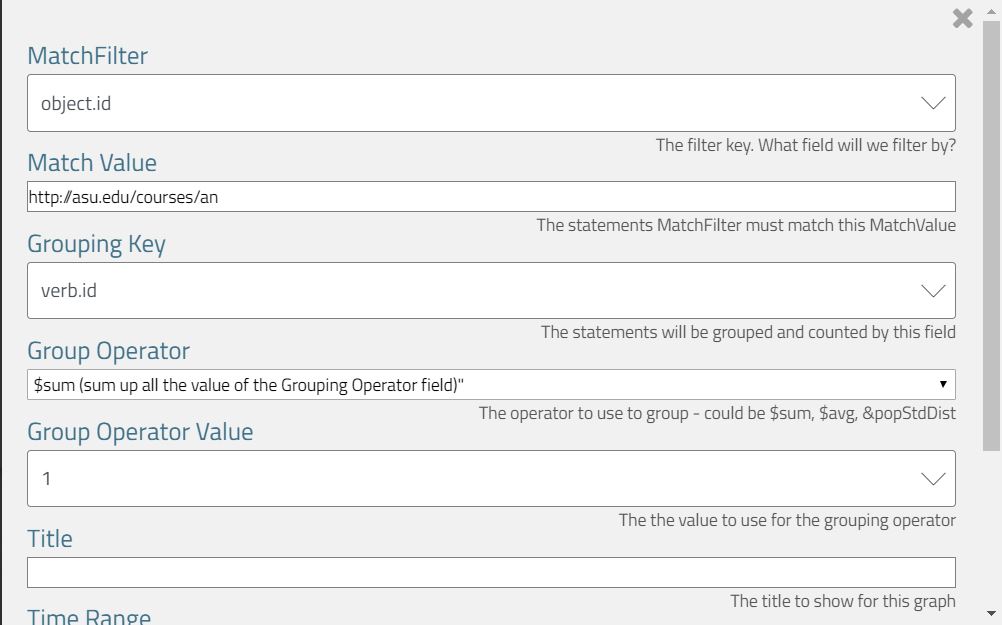 The group operator value tells Veracity Learning LRS where to get the values. Choosing a grouping operator of "sum" and a grouping operator value of "1" means "Count the statements that went into each group."