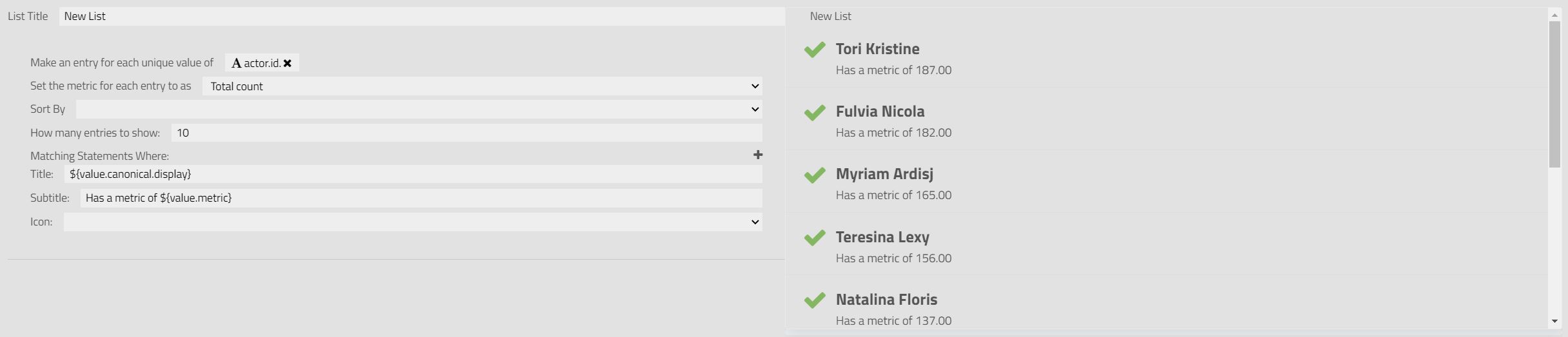 The list builder works almost exactly like the Chart Builder, but with a different graphical rendering. Please see the documentaiton on the Chart Builder for information on how to filter and sort data, or compute metrics.