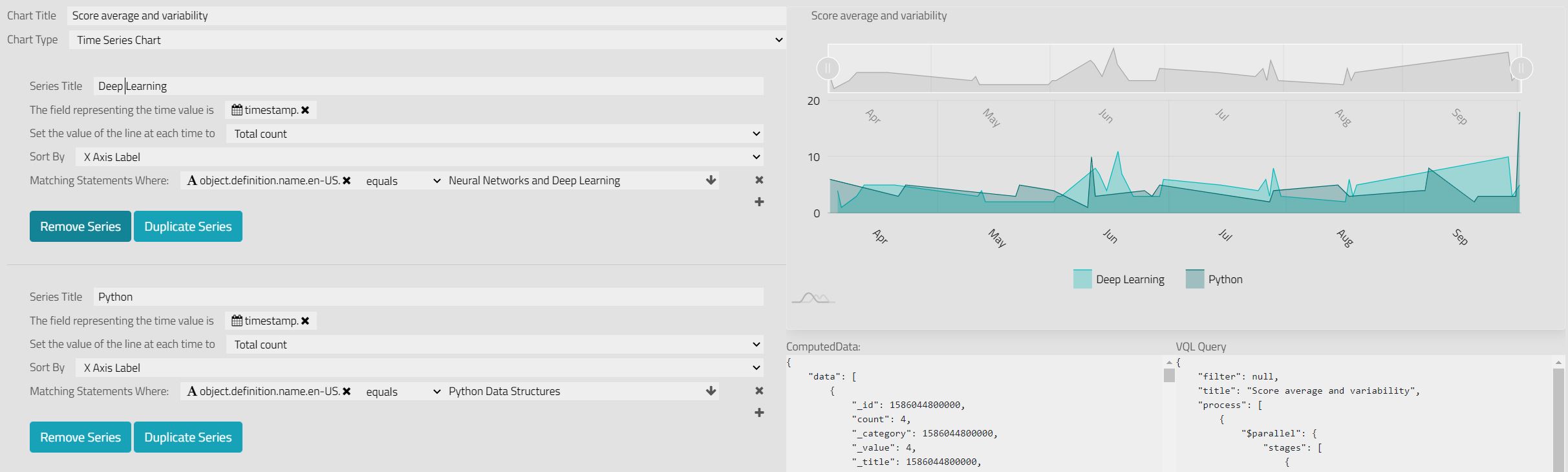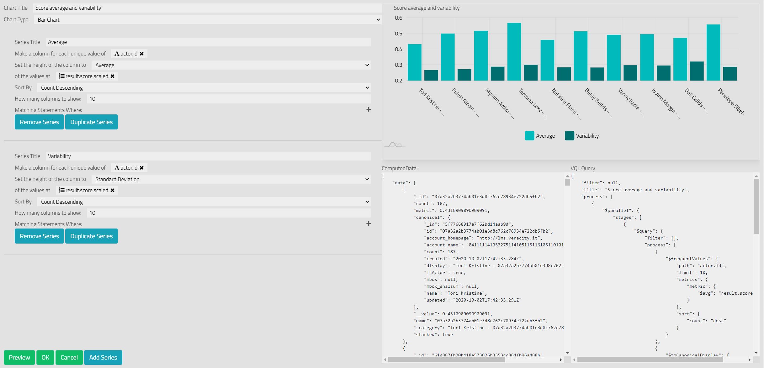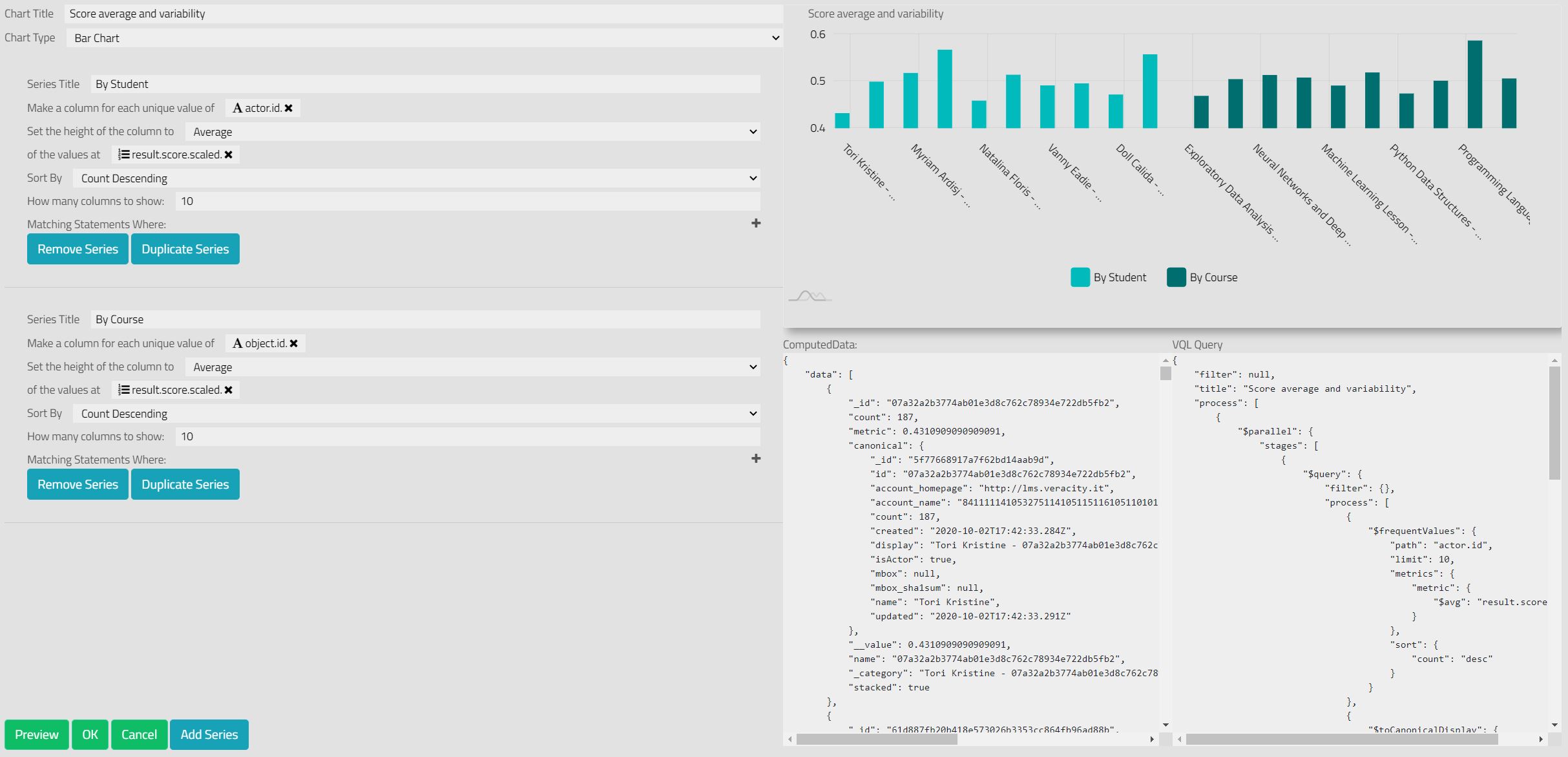Veracity Learning LRS exposes a highly customizable set of widgets that can build a huge variety of charts. These are the Generic Pie, Generic Bar and Generic Serial charts. Each exposes a query builder that will help you build complex queries.