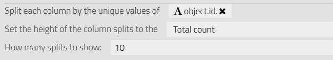 A time series chart can be split just like a pie or bar. Note that not every line will extend to the bound of the graph, and not every split value has data at every time. Here, we split the above graph by actor.id. Because the split metric is count, we see the relative traffic over time on this course for the top 10 actors.