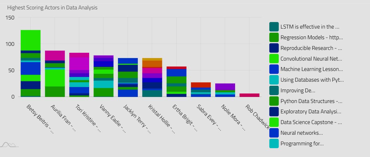 This graph adds a filter, so we're seeing the top scoring actors on only the Data Analysis course